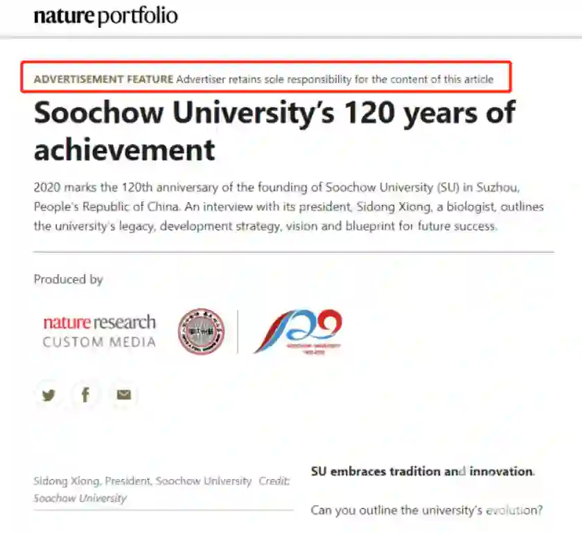 南京大学近期文章也被明确标出是「advertorial」| 图片来源:Nature