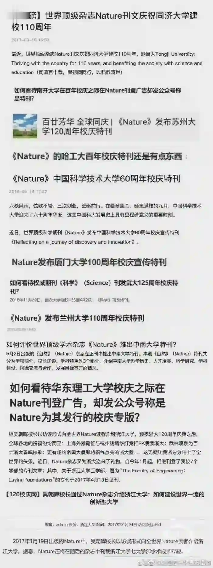 等11所国内“双一流”大学在他们校庆之际通过Nature杂志刊登相关校庆文章的标题。