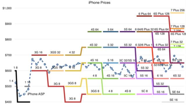 根据分析博客 Asymco 的统计,过去的 iPhone 价格走势是这样的: