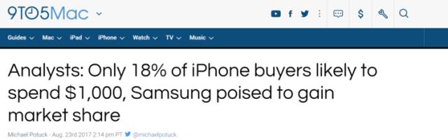权威分析机构巴克莱 (Barclays)分析师预计,只有 18% 的 iPhone 用户愿意花 1000 美元以上购机。