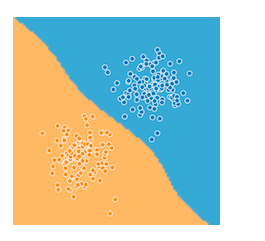 在二元分类或多类别分类问题中,模型学到的类别之间的分界线。例如,在以下表示某个二元分类问题的图片中,决策边界是橙色类别和蓝色类别之间的分界线: