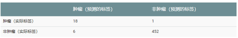 多类别分类问题的混淆矩阵有助于确定出错模式。例如,某个混淆矩阵可以揭示,某个经过训练以识别手写数字的模型往往会将 4 错误地预测为 9,将 7 错误地预测为 1。混淆矩阵包含计算各种效果指标(包括精确率和召回率)所需的充足信息。上面的混淆矩阵显示,在 19 个实际有肿瘤的样本中,该模型正确地将 18 个归类为有肿瘤(18 个真正例),错误地将 1 个归类为没有肿瘤(1 个假负例)。同样,在 458 个实际没有肿瘤的样本中,模型归类正确的有 452 个(452 个真负例),归类错误的有 6 个(6 个假正例)。