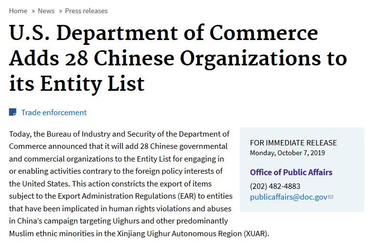 2019 年 10 月,美商务部产业安全局(BIS)对《出口管理条例》(EAR)第 744 章补充文件 4 所列出的“实体清单”进行修订,将中国 28 家实体增列入出口管制“实体清单”。