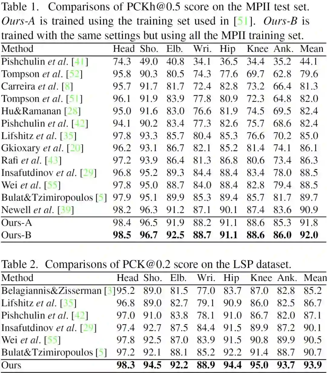 本文在 MPII 和 LSP、LSPEt 数据集上进行训练,使用 PCK (Percentage of Correct Keypoints) 和 PCKh 进行评估,PCK 计算估计的关键点与真实值间的归一化距离小于设定阈值的比例,PCKh 则以头部长度为参考的归一化。实验结果如下,可以看到使用 PRM-B 的 PyraNet 在所有对比的方法中都取得了最好的准确率。