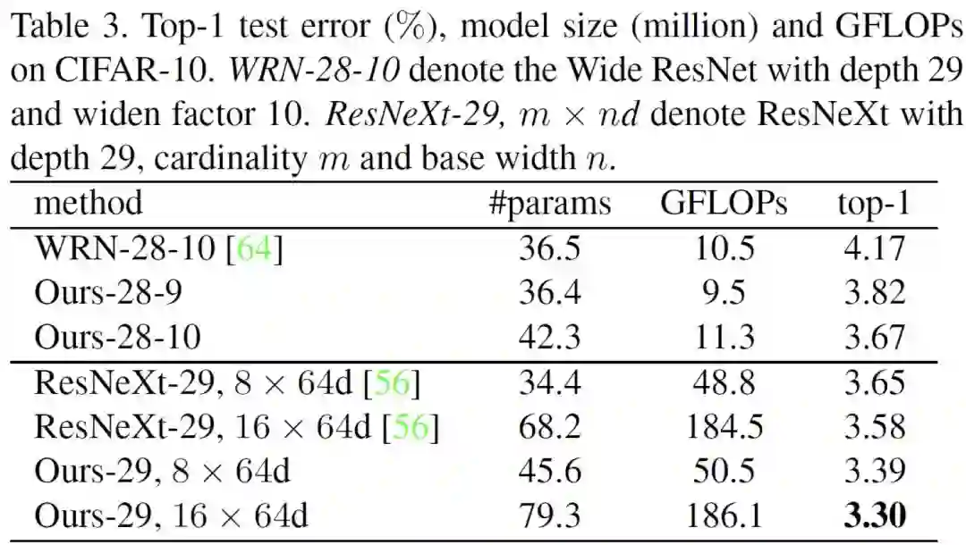 本文作者使 PRM 替代相应网络的残差模块在 CIFAR-10 上进行训练,得到最低的 Top-1 测试误差,但网络的大小和运算量稍有增加。