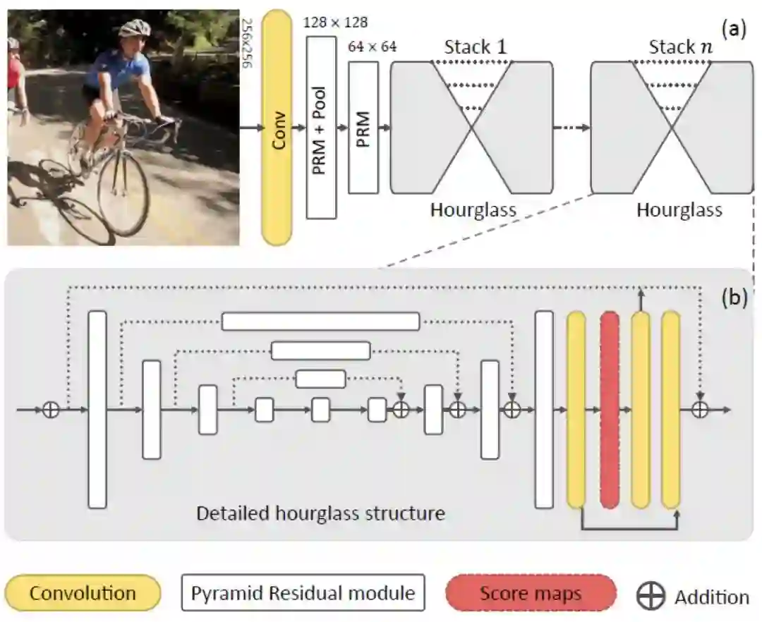 本文网络框架使用 Stacked Hourglass Network 的基本框架,但将其中的残差模块都替换成了上述特征金字塔模块 PRMs,网络结构图如下。