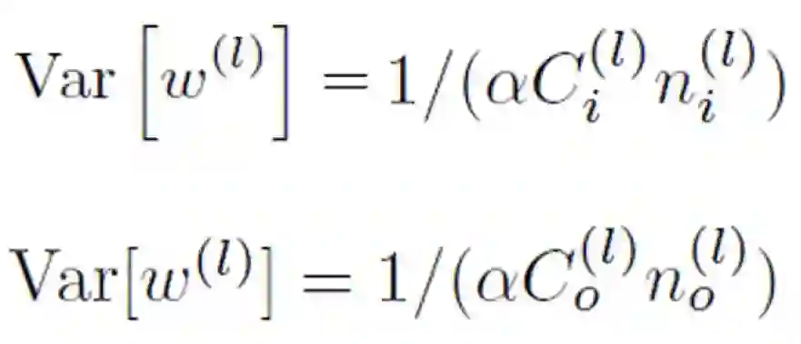 本文作者考虑到提出 Xavier 时的大部分网络并没有多条分支,因此对多分支网络的初始化方案重新考量,得出了如下的更泛化的结果。其中 l 表示网络层数,C_i 和 C_o 分别表示输入和输出分支数,n_i 和 n_o 分别表示各输入和输出分支的元素个数,α 根据激活函数有不同取值,ReLu 取 0.5。即从前向和反向传播的角度考虑,各层参数初始化时的方差应与各输入分支合并前的总元素个数、各输出分支分离后的总元素个数有关。