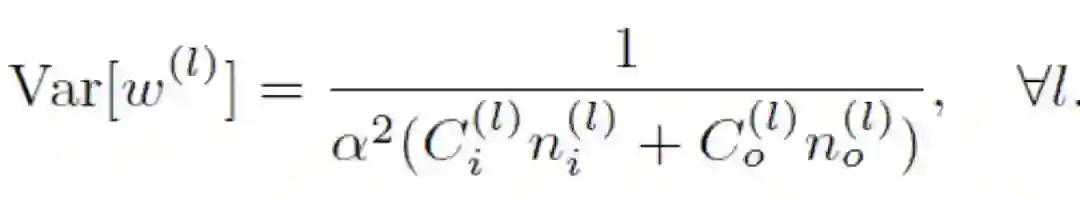 折衷考虑,多分支参数初始化的方差在文中应为满足如下式子。注意到 α 带有平方,特殊情况下,若 α 取 0.5,输入输出均只有 1 条分支,结果与 Xavier 不一致,因此笔者认为 α 不应取平方,这样在上述情况下仍能 Xavier 保持一致,作为 Xavier 的泛化。