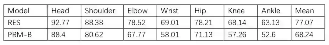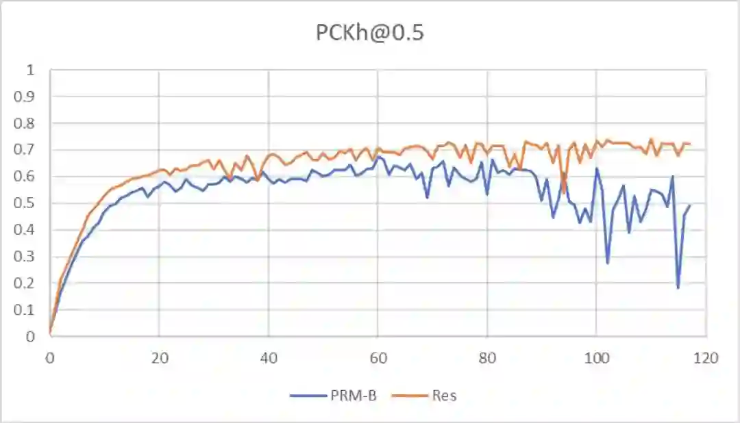 6. 实验结果:本次复现结果使用 PRM-B 模块的 PyraNet 并没有比使用 Res 模块的堆叠沙漏网络效果要好。准确率使用 PCKh@0.5 进行评估。