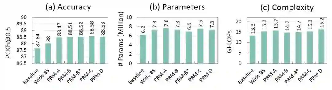 根据后面的实验结果可以看到在准确率、参数数量和复杂度的权衡之下,PRM-B 模块是较好的选择。