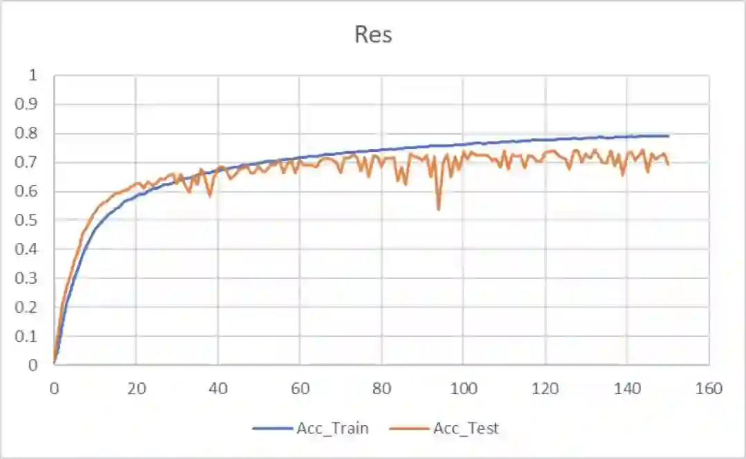 准确率曲线如下:使用 PRM-B 由于发生了过拟合,在 Epoch=110 处进行了早停,而使用 Res 则在 Epoch=110 时接近收敛。