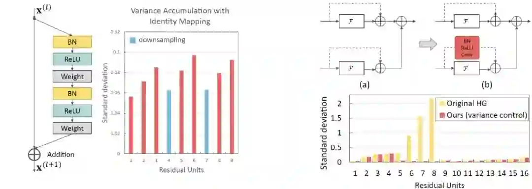 除了上述的改进,本文作者还提到原始的残差模块有输出方差积累的问题,当堆叠多个残差块时,将原始特征直接与卷积后的特征相加时会有较大的方差,通过对原始特征添加一个 Bn-ReLu-Conv 操作可以较好的控制这个问题。