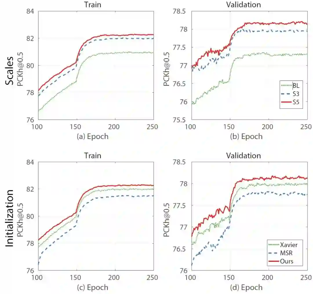 人体姿态检测相比于简单的图片识别、生成,数据处理过程更复杂,计算量更大,网络结构一旦变得复杂,就会变得难以训练。同时网络变得更大参数数量急剧增加,只能用很小的批大小进行训练,也容易使得网络陷入局部最小值。