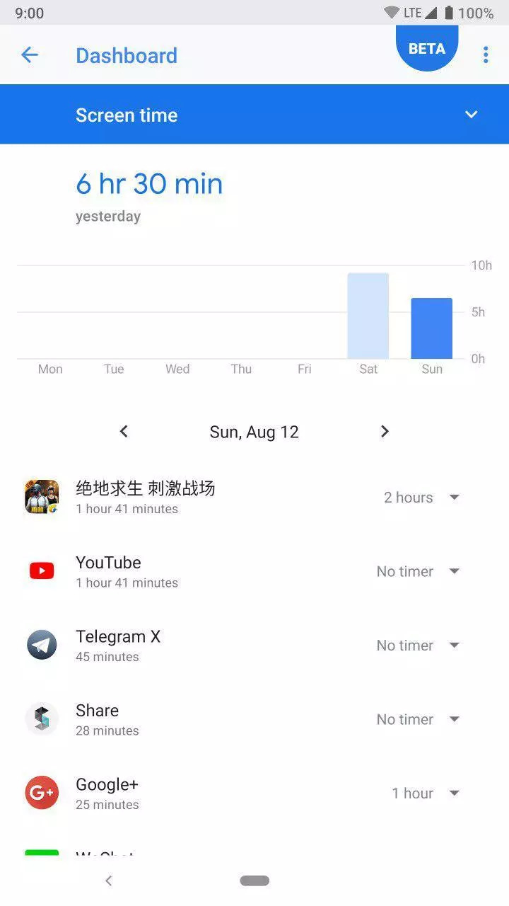 在 I/O 2018 Keynote 的演示中,Dashboard 的样式其实就是上文提到的主界面彩色圆环。但在这次放出的 Beta 版本中,Dashboard 作为 Digital Wellbeing 下的一个子功能,在将彩色圆环样式让位给主界面概览后,采用了顶部蓝色柱状图加底部列表的形式来展示具体的使用数据。