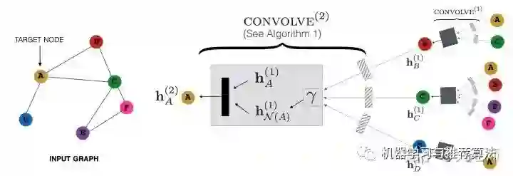 GCN(图卷积)接收拓扑图作为网络输入,可以计算每一个顶点更好的表示,相比graph-embedding可以有监督地为推荐目标而训练。但GCN在运算时,每一层都要输入整个图,在推荐系统里,物品和用户都可以是百万级别以上,实际中无法使用。GraphSAGE通过RandomWalk采样,解决了这个问题,用在推荐领域就是PinSage算法。从某顶点出发,深度优先走k步,得到多个子图,组成一个batch进行训练,。然后按照采样的反方向做前向传播,这就是一个k层的图网络,下图是一个k为2的例子。
