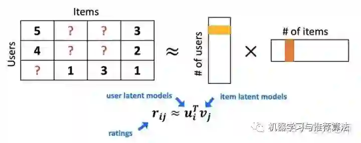 两个低维矩阵,用户对某物品的评分,等于他过去评分过的物品在