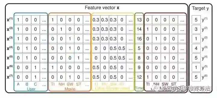 在MF的基础上,考虑推荐中的side information,如用户的年龄性别,物品的类目价格。用户和物品自身或属性称作一个field,field之间可以两两进行矩阵分解,这个被称作二阶项,类似BiasSVD考虑每一个field都有一个bias,这个被称作一阶项,再加上一个全局的bias项。这就是著名的Factorization Machines(FM)。