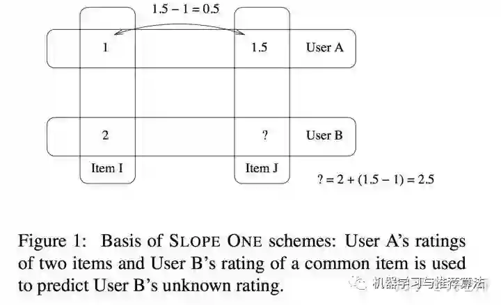 对于任何两个物品,可以计算它们的评分差值。具体来说,两个物品有一批共同的历史评分用户,也就是矩阵里两列有交集的行,每一行可以计算一个差值,将差值平均起来,作为两个物品的距离。和上面的距离不同的,这个差值可以想象成物理中的位移,带着符号的。推荐时,某用户对于某个物品的评分,等于某用户对其他物品评分加上这个位移,再进行平均得到的平均评分。和上面的item-base一样的,都是列向量计算相似度,只不过相似度由距离变成了位移。这就是著名的Slope-One算法。