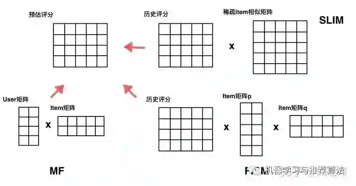 中该物品向量内积的和,这就是FISM算法。相比SLIM的稀疏处理,变为分解降维。最后再附上一张图,说明MF,SLIM和FISM之间的关系。