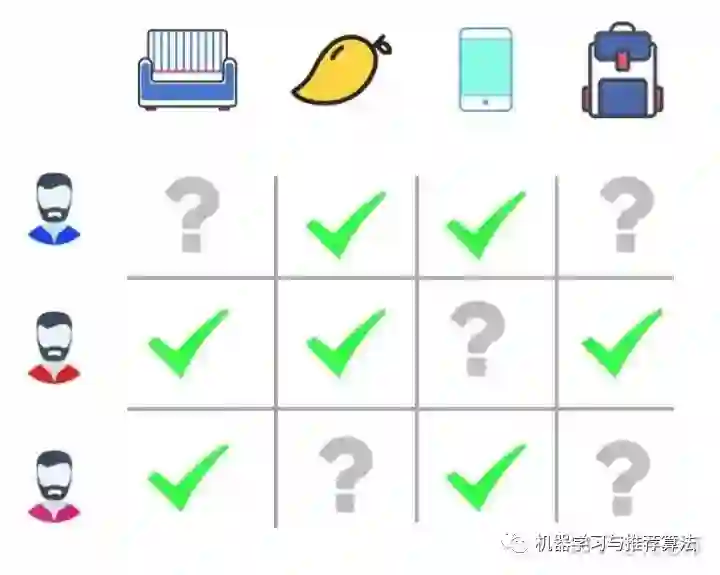 在脑中想象一个二维的表格,每一行代表一个用户,每一列代表一个物品,表格里的每一个点代表用户对物品的操作,这个操作可以是评分,点击,点赞。其中,有些格子记录了行为,有些格子是空的。到这里,我们就建立了基本的矩阵视角,推荐问题转化成了如何补上那些空格子。