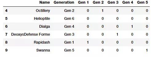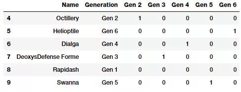 pd.concat([poke_df[['Name', 'Generation']], gen_dummy_features], axis=1).iloc[4:10]