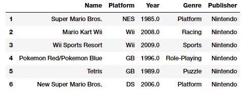 vg_df[['Name', 'Platform', 'Year', 'Genre', 'Publisher']].iloc[1:7]