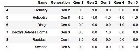 上面的输出清楚地表明,与虚拟编码中的零不同,属于第六代的神奇宝贝现在由 -1 向量表示。
