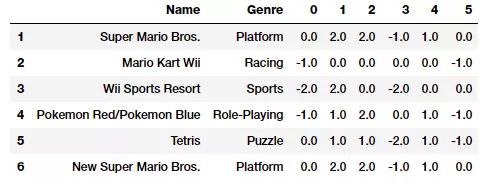 hashed_features = hashed_features.toarray()pd.concat([vg_df[['Name', 'Genre']], pd.DataFrame(hashed_features)], axis=1).iloc[1:7]