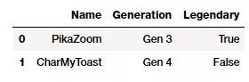new_poke_df = pd.DataFrame([['PikaZoom', 'Gen 3', True], ['CharMyToast', 'Gen 4', False]], columns=['Name', 'Generation', 'Legendary'])