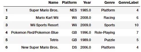 vg_df[['Name', 'Platform', 'Year', 'Genre', 'GenreLabel']].iloc[1:7]