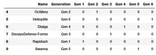 pd.concat([poke_df[['Name', 'Generation']], gen_onehot_features], axis=1).iloc[4:10]