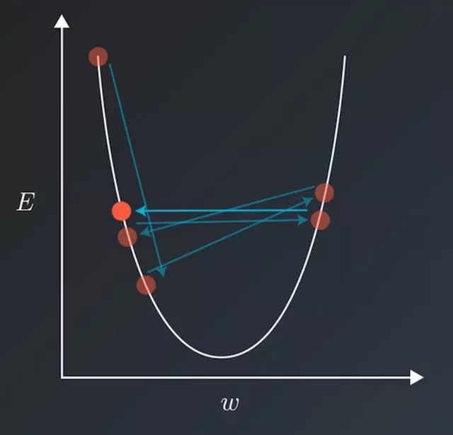 如果让人来走,可能就不一样了,你可能会先随便选一个方向,然后沿着这个方向的梯度向下走;过一会儿再随机换一个方向向下走;最后你发现自己差不多也到了谷底了。