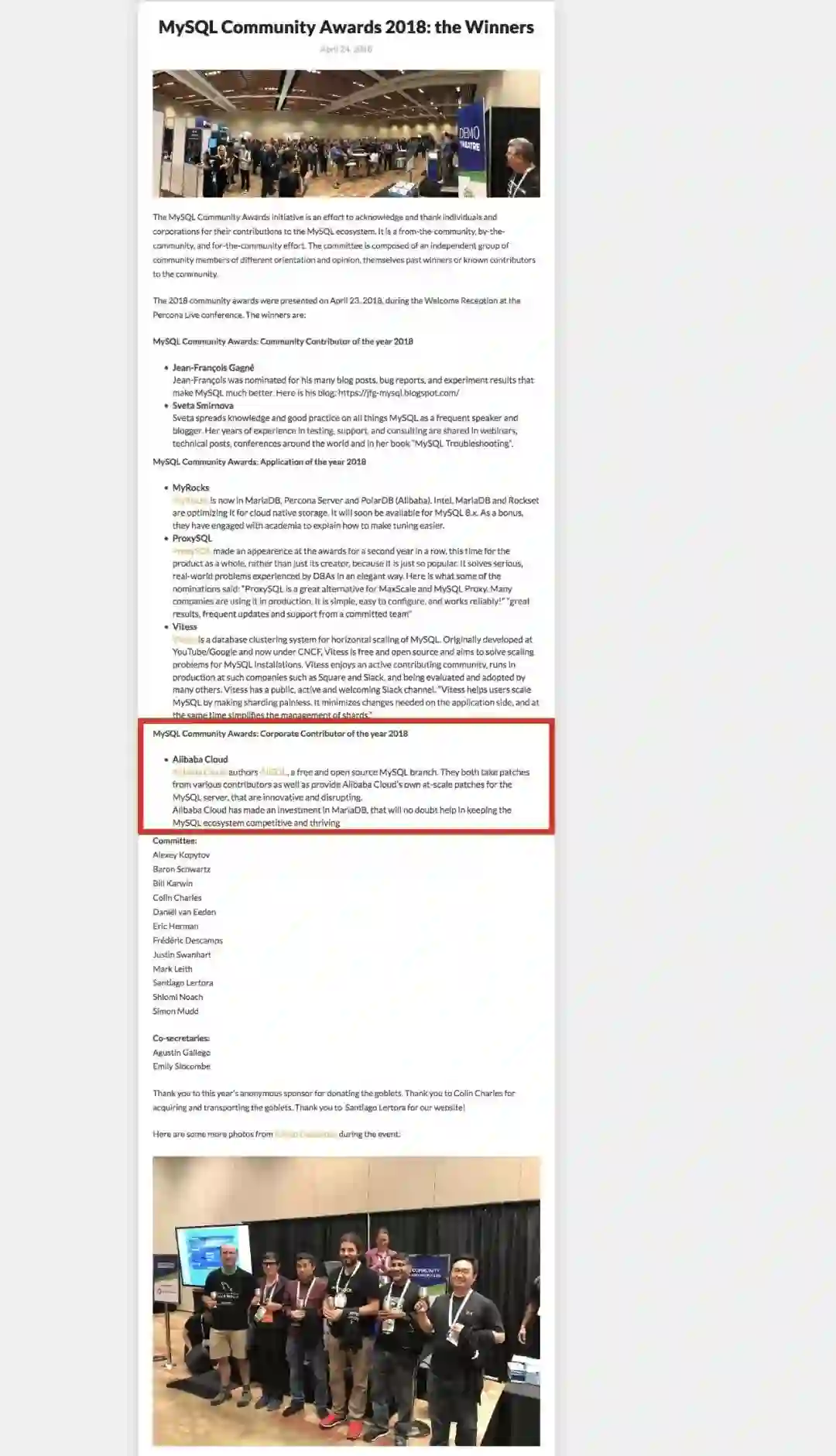MySQL社区在官网表示,此次颁奖旨感谢阿里云多年持续不断的给社区贡献Patch和Idea,不断的帮助官方和社区提升MySQL,以及开源AliSQL和配套的AliXtrabackup备份工具,和投资MariaDB保护MySQL开源生态。