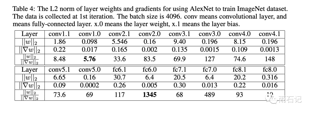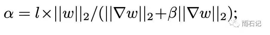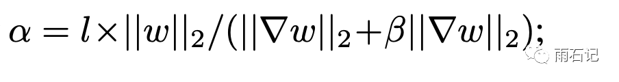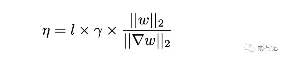 这个方法就是使用参数和梯度的比值来作为学习率的一个因子。如下图,γ是初始的学习率,一般设置一个1到50之间的数字;l是缩放因子,一般设为0.001,最后一项就是权重除以梯度,这里权重和梯度都是矩阵,所以使用了它们的L2-norm。