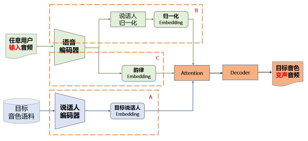 其中 A、B、C 组成了表征学习部分,后面的注意力机制和解码器组成了语音变声模块。这里可能令人疑惑的是,为什么说 B 和 C 两个嵌入向量能学习到内容与韵律,注意力机制又是怎样结合三大特征?