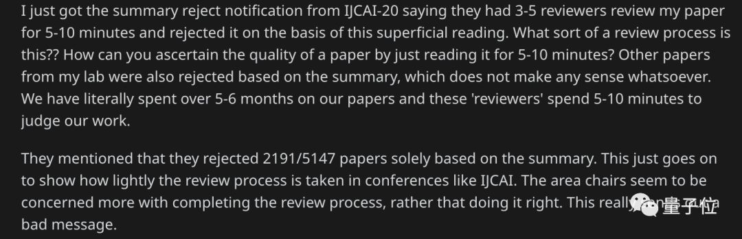 我实验室的其他论文也因此而被拒绝,这毫无意义。我们在论文上花了5-6个月的时间,而这些“评论员”花了5-10分钟来评判我们的工作。这只能证明,在类似 IJCAI 的会议上,审查过程是多么的轻松。