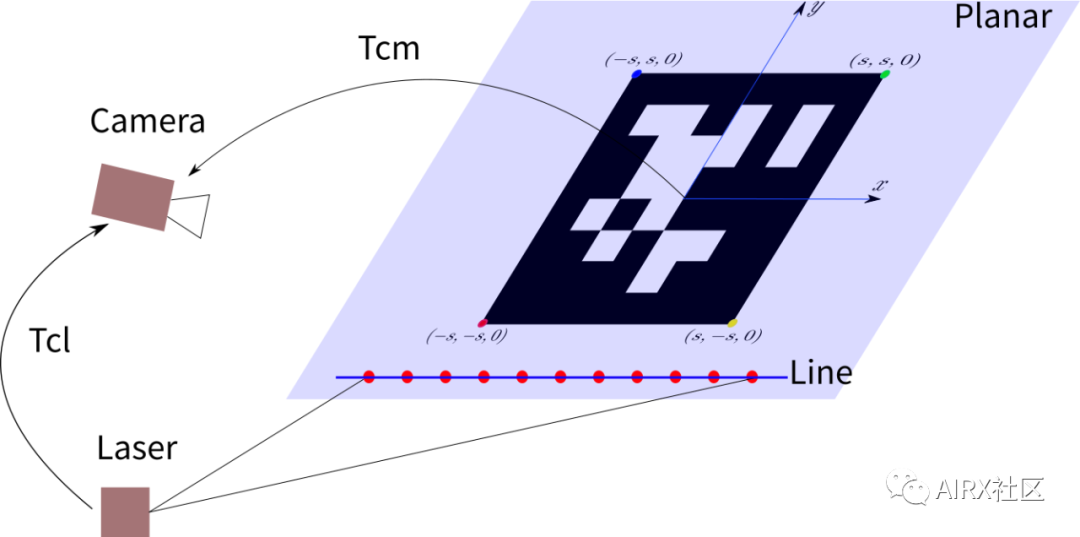 摄像机和二维激光的外部标定。这是一个基于 ROS 的单线激光和相机外参数自动标定代码。标定原理如下图所示,相机通过二维码估计标定板平面在相机坐标系下的平面方程,由于激光点云落在平面上,将点云通过激光坐标系到相机坐标系的外参数 $ T_{cl} $ 转换到相机坐标系,构建点到平面的距离作为误差,使用非线性最小二乘进行求解。