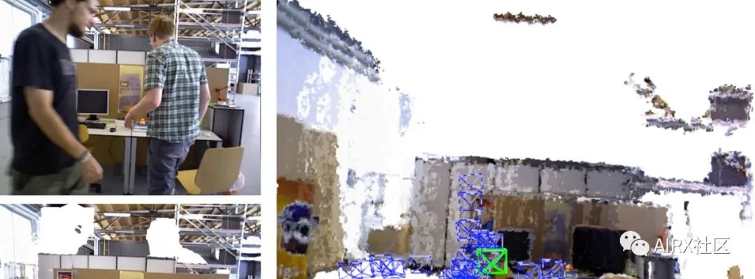 XIVO是用于视觉惯性测距/映射的开源库。XIVO在存储的数据(此处来自RealSense D435i传感器)或实时流上以140FPS的速度运行,延迟时间约为1-7ms,具体取决于硬件。它以来自经过校准的摄像机的视频帧和来自IMU的惯性测量为输入,并输出具有摄像机特性属性和6 DOF姿态的稀疏点云。它执行摄像机和IMU之间的相对姿态的自动校准以及时间戳对齐。