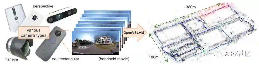 OpenVSLAM基于具有稀疏功能的间接SLAM算法,例如ORB-SLAM,ProSLAM和UcoSLAM。OpenVSLAM值得注意的功能之一是该系统可以处理各种类型的摄像机模型,例如透视,鱼眼和等角矩形。如果需要,用户可以轻松实现额外的相机模型(例如双鱼眼,折反射)。例如,上面显示了使用等矩形相机模型(例如RICOH THETA系列,insta360系列等)的可视SLAM算法。