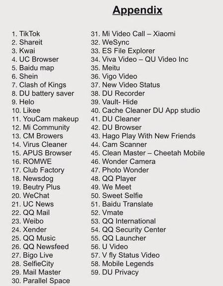 6月30日,印度以“威胁国家安全”为由,宣布封禁包括Tiktok和wechat(微信海外版)在内的59款中国手机App。