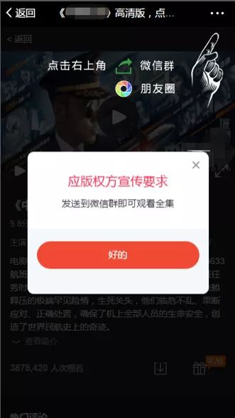 像下面截图中的这种外链,显然是想利用用户看免费盗版视频的心理,诱导他加入相应的微信群,达到拉人头的目的。