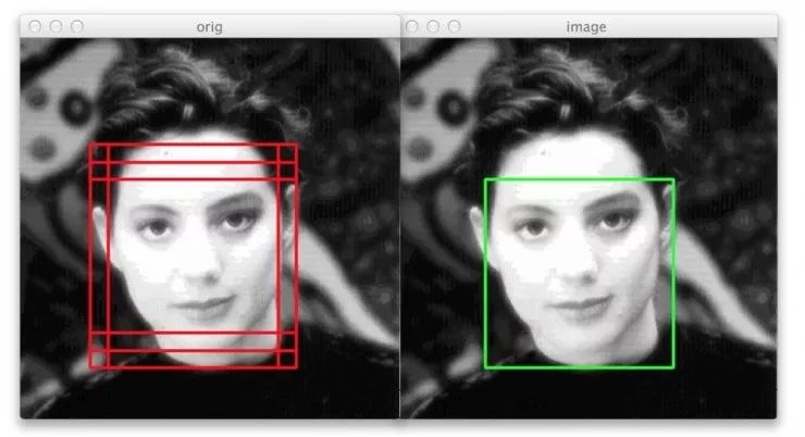 图 3:在面部周围检测到6个检测框,但是通过应用快速非极大值抑制算法,我们能够正确地将检测框的数量减少到1个。