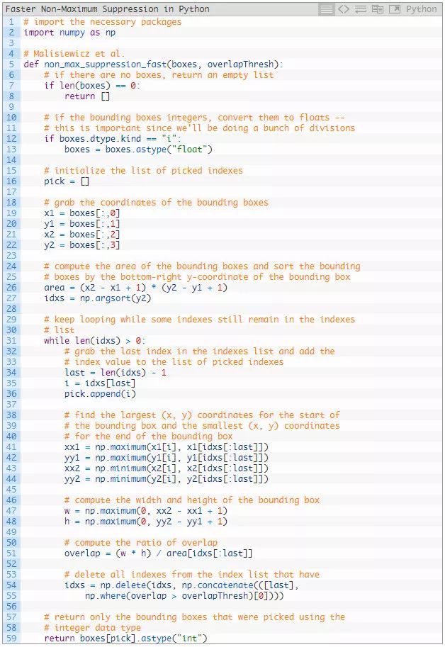注意:你在这里必须使用 np.maximum 和 np.minimum——它们允许您混合标量和向量。然而 np.max 和 np.min 函数就没有这样的功能,当你使用它们时,你会发现有一些非常严重的 bug 需要查找和修复。当我把算法从 Matlab 移植到 Python 时,我花了很长时间来解决这个问题。第 47 行和第 48 行也被矢量化,在这里我们计算每个矩形的宽度和高度来进行检查。相似的,第 51 行上的重叠率也被矢量化。从那里,我们只需删除我们的 IDX 列表中的所有条目,这些条目都大于我们提供的重叠阈值。通常重叠阈值在 0.3-0.5 之间。