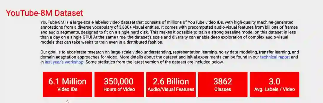 Youtube-8M 2018 是一个大型标记视频数据集,由 600 万个 YouTube 视频 ID 组成,目前具有 4700 多个视觉实体标签,同时它还配备了数十亿帧和音频片段的预先计算的视听功能。