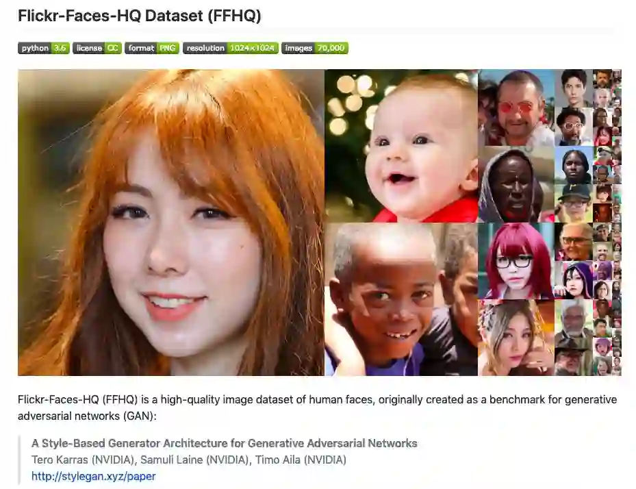 英伟达推出的 Flicker 人脸高清数据集(FFHQ)由 70,000 个高质量的 PNG 格式图像组成,分辨率为 1024*1024。这些图片在年龄、种族和图像背景方面有很强的多样性,并且还有如眼镜、太阳镜、帽子等元素。