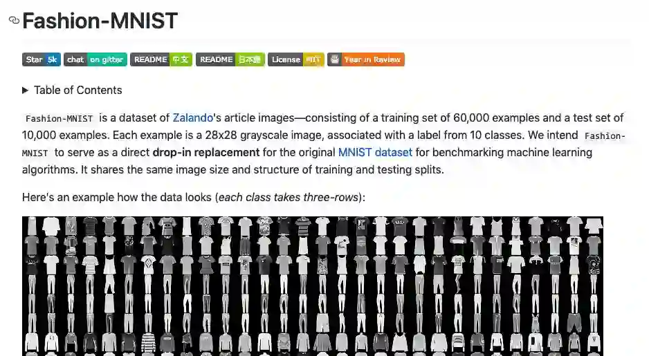Fashion-MNIST 由德国研究机构 Zalando Research 公布,包含 60000 个样本,测试集包含 10000 个样本,分为 10 类,每一个都是 28×28 的灰度图。