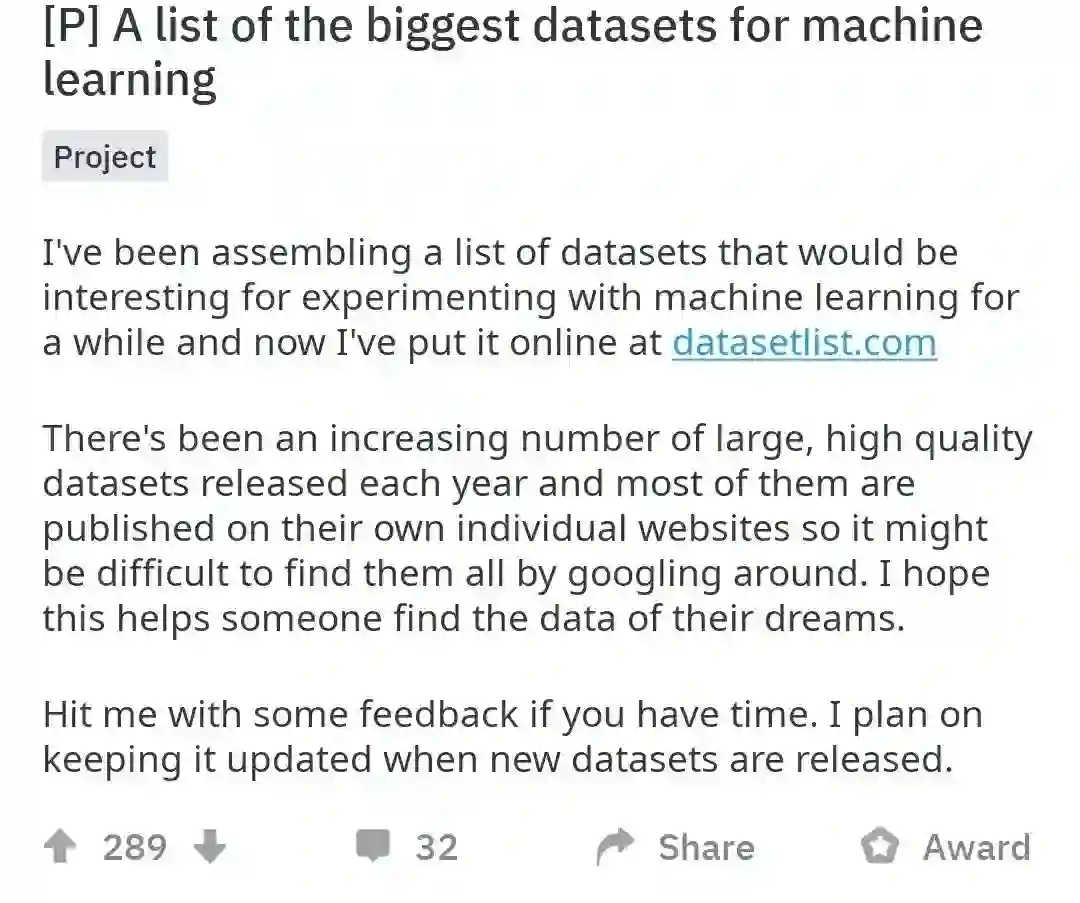 这套数据集搜索列表的出现,也满足了不少强迫症患者对于选择 / 整理数据集的想法。不过,也正如这位网友所言:这个数据集列表的形式将有待完善和丰富,设计这个网页的目的也是希望接下来不断更新新的数据集,同时,用户也可以通过邮箱、Twitter、Facebook 等方式订阅以获取最新内容。