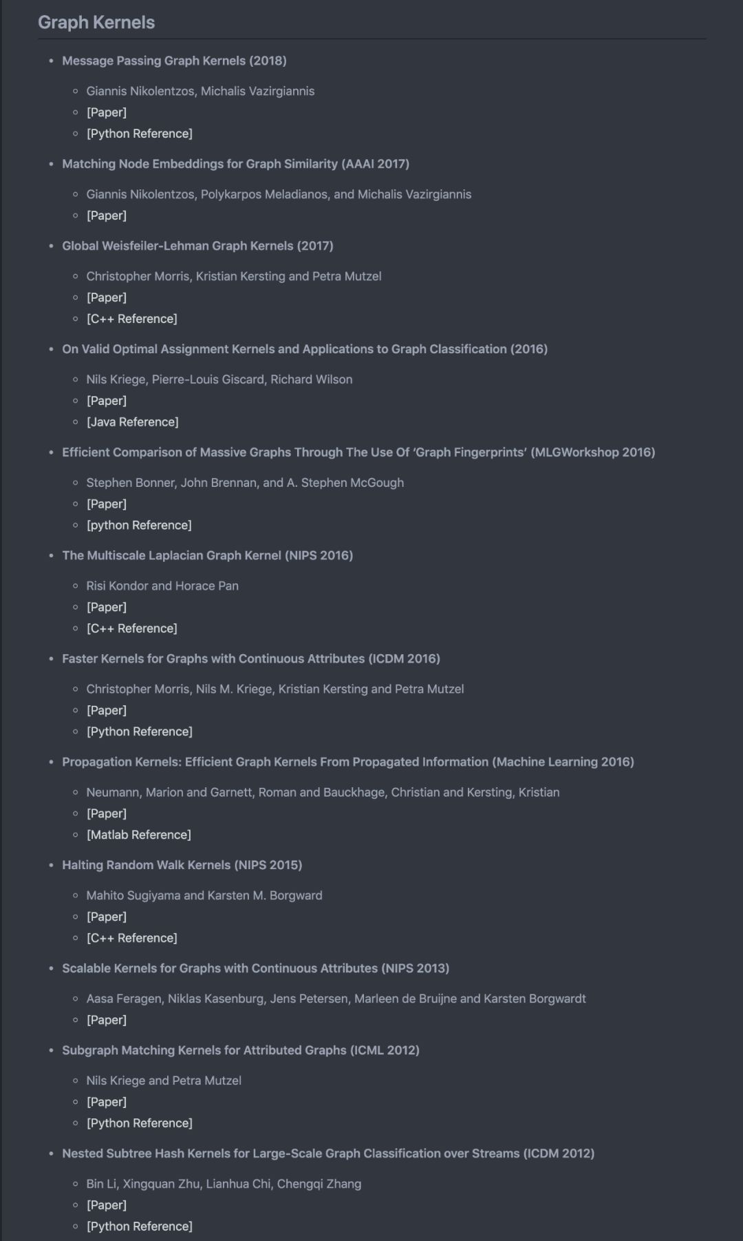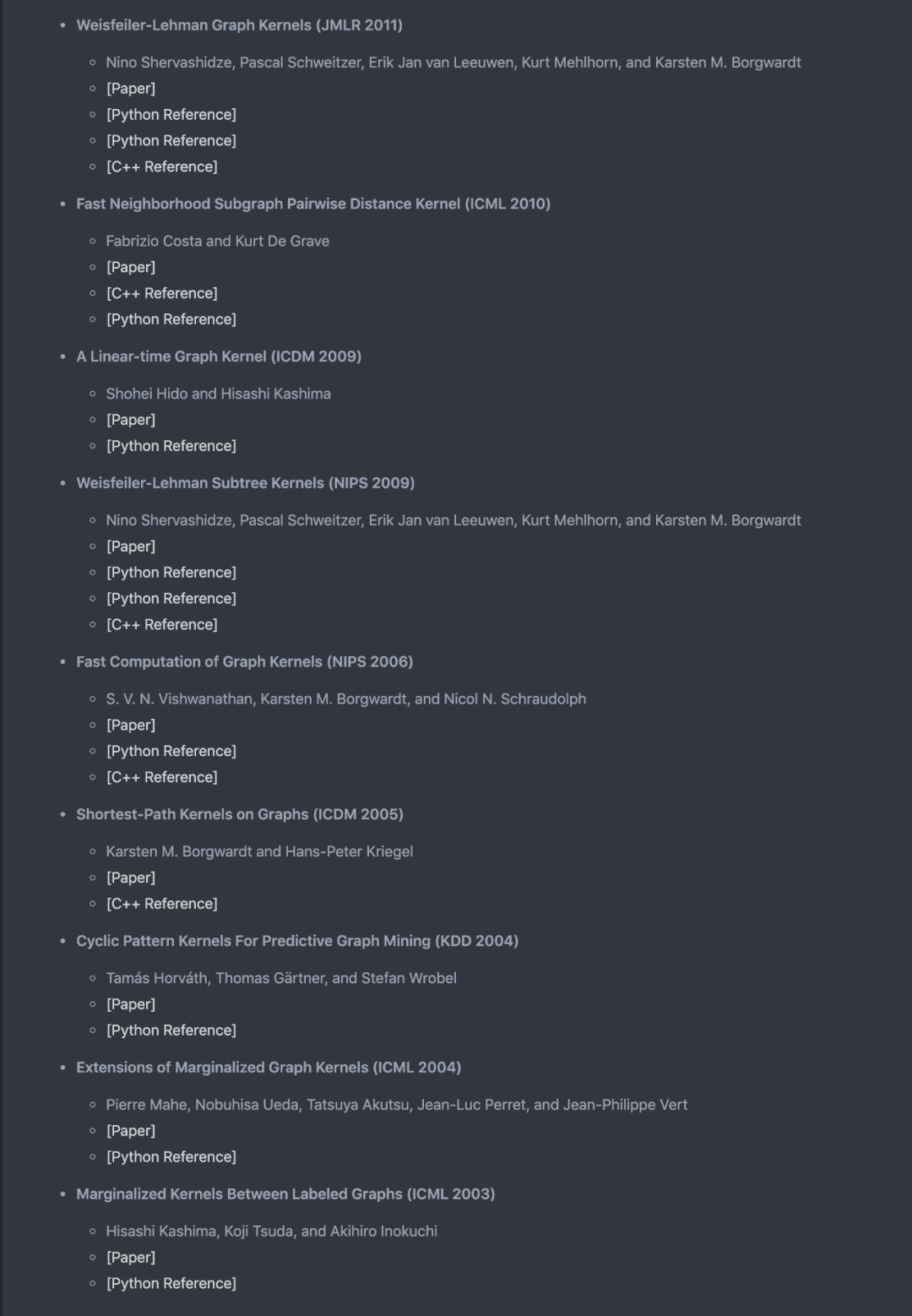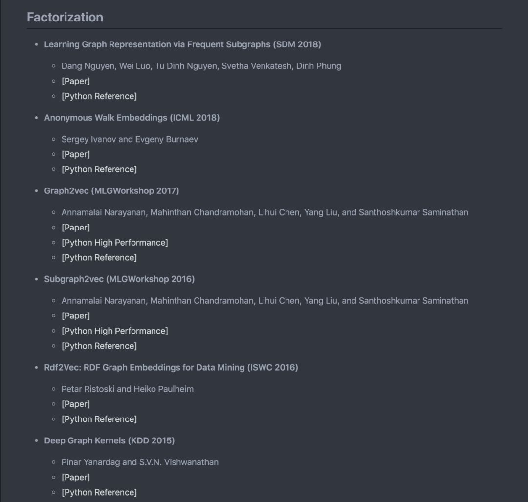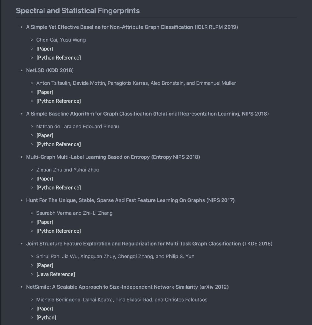 那么它和PyTorch Geometric有什么区别呢?PyTorch Geometric仅涵盖了深度模型,本仓库则相对更全一些。如果没有node和edge功能,本仓库中搜集的则隐式因子分解(如Graph2Vec,AWE)和统计指纹(如NetLSD)就很有竞争力了。