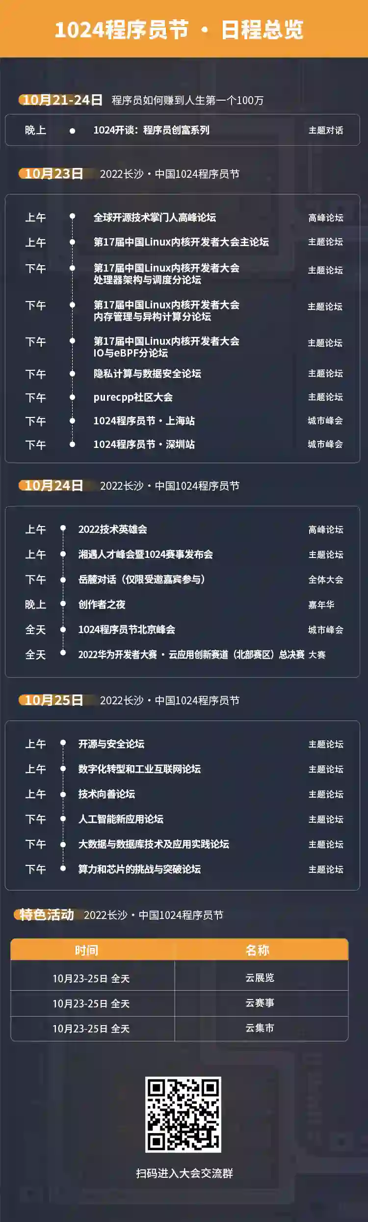 第 17 届中国 Linux 内核开发者大会作为 2022 长沙·1024 程序员节首日的高端论坛,邀请了腾讯操作系统研发负责人、OpenCloudOS 社区技术委员会委员王佳,阿里云资深技术专家、OpenAnolis 龙蜥开源社区技术委员会委员宋卓,华为 OS 内核实验室资深技术专家、openEuler 社区内核 Maintainer 郭寒军等一线技术大厂前沿专家出席,主论坛+三大分论坛全天候直播,为开发者带来不可多得的技术盛会。