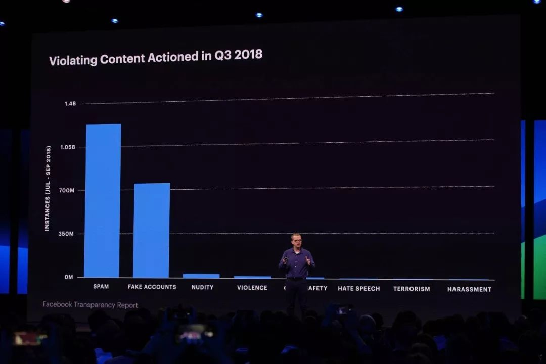 在第二天的主会场上,Facebook CTO Mike Schroepfer 分享了过去一年公司在 AI 应用上的进展。其中最主要的是用 AI 来分辨有害信息和虚假账号,在 2018 年,该系统成功识别了数以亿计的有害信息和假账号。